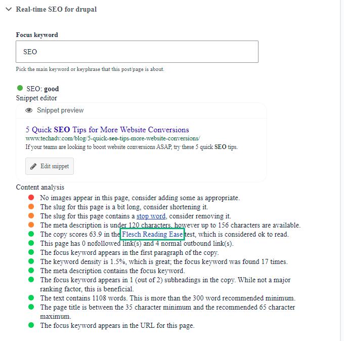 There are a plethora of plug-ins and add-ons you can incorporate into your website to help guide your SEO and readability. We use one called “Real-time SEO for drupal” that applies color-coding to tell us if our SEO is excellent or poor based on several factors. It gauges readability on FRE standards.