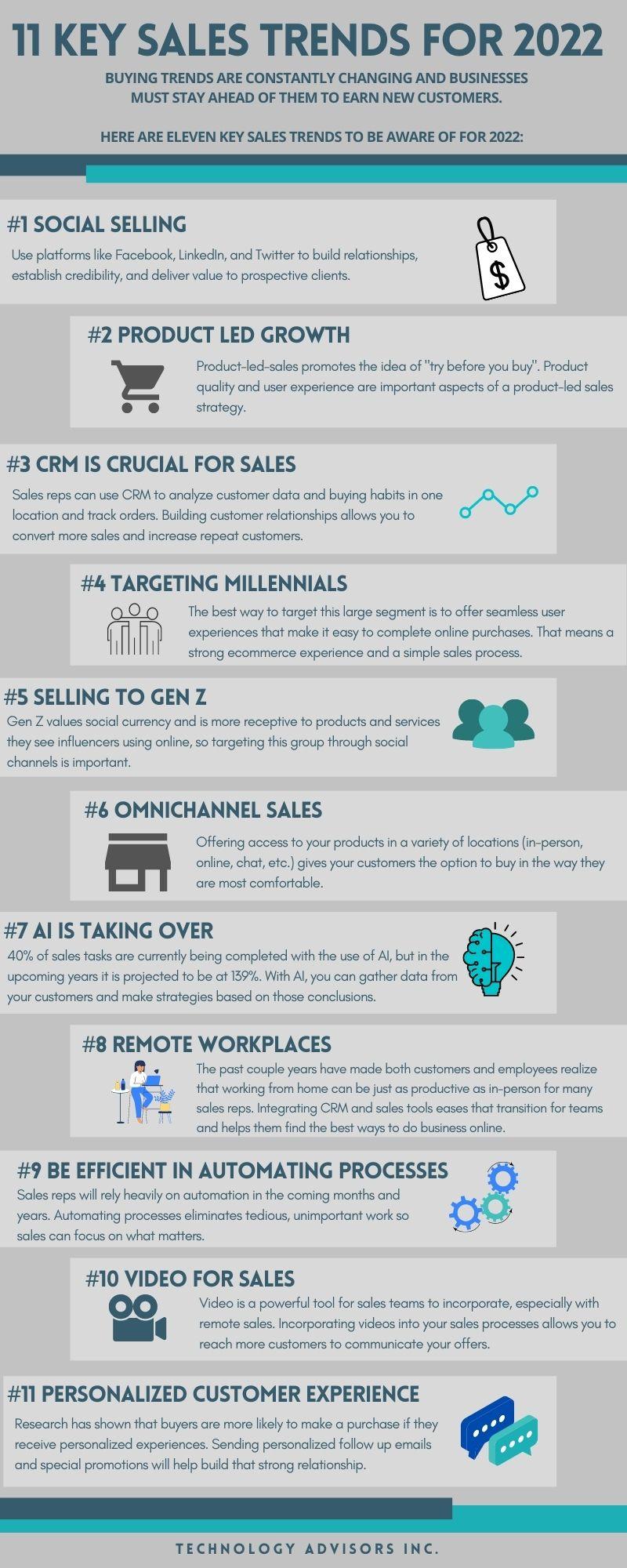 Buying trends are constantly changing and businesses must stay ahead of them to earn new customers. Here are eleven key sales trends to be aware of for 2022: